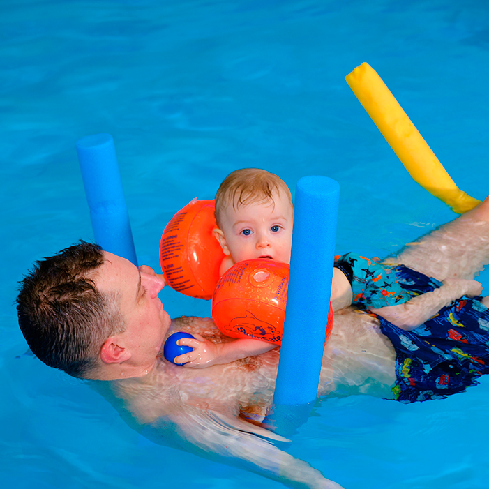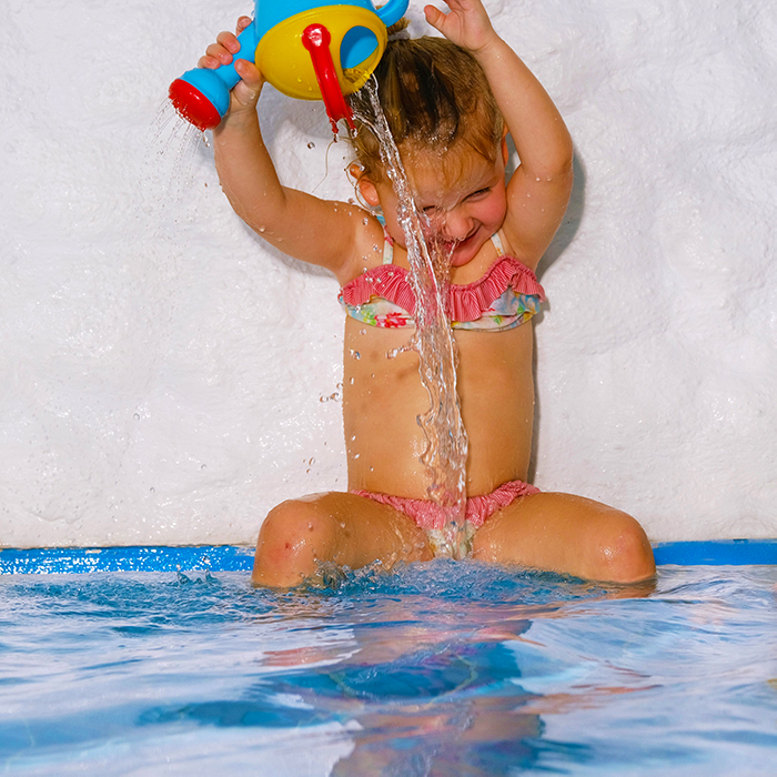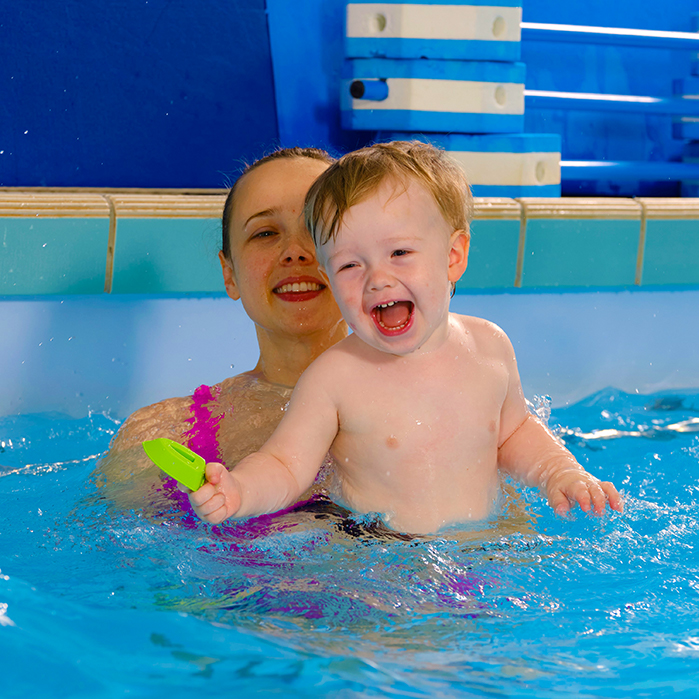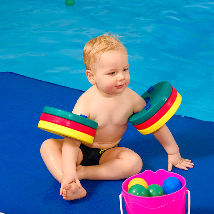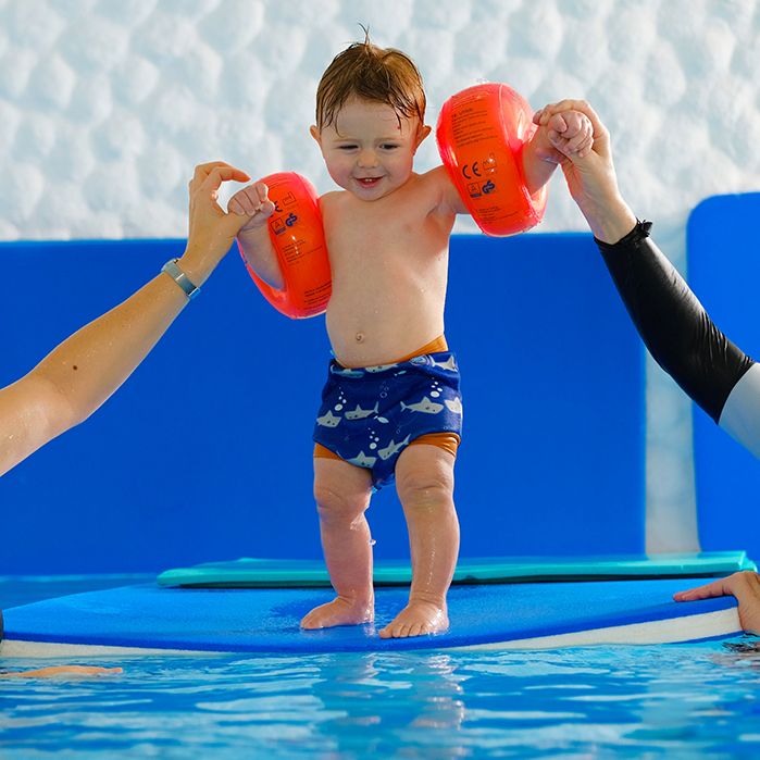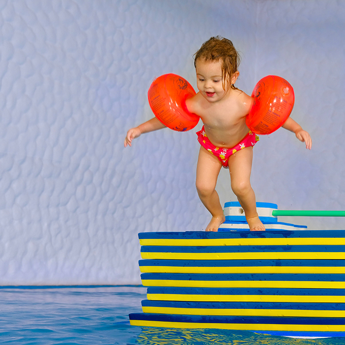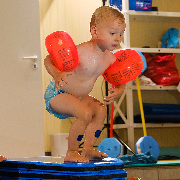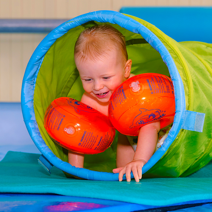 Klettern, Springen, Tauchen, Rutschen aber auch Grundfertigkeiten, die den Kindern im späteren Schwimmkurs helfen wie Gleiten, Schweben, Balancieren und die Wassergewöhnung sind Inhalte des Kleinkindschwimmens.